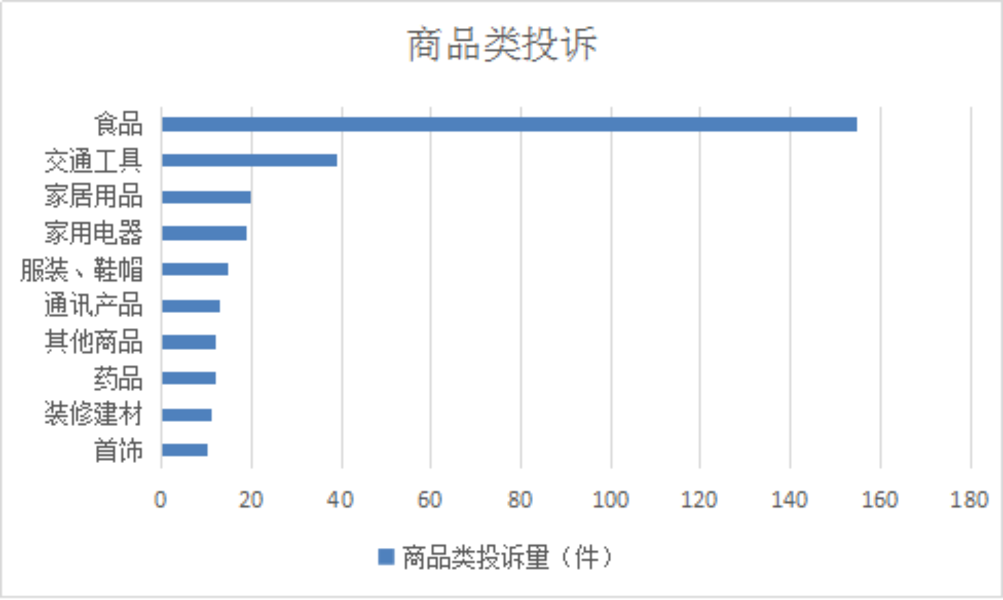 2025年11月,商品类投诉排名前十位的是:食品(155件)、交通工具(39件)、家居用品(20件)、家用电器(19件)、服装、鞋帽(15件)、通讯产品(13件)、其他商品(12件)、药品(12件)、装修建材(11件)、首饰(10件)。